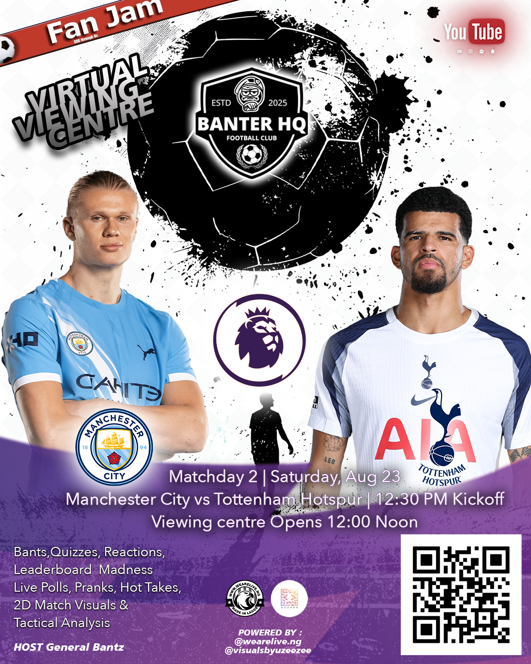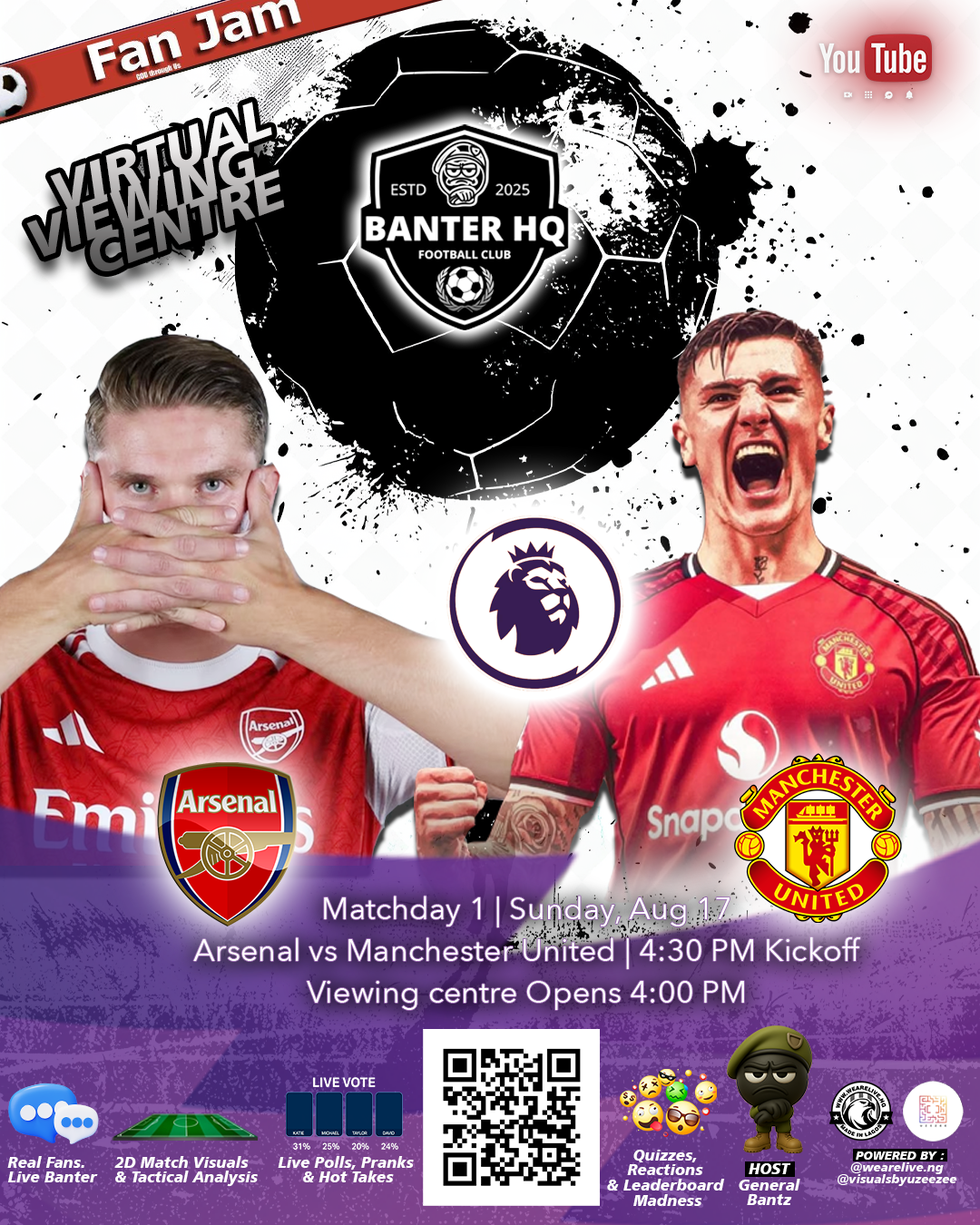 Welcome to BanterHQ, your ultimate virtual football viewing centre where fans don’t just watch — they banter, predict, react, and play! Every matchday, we bring fans together for live watch-along shows, spicy hot takes, quizzes, tactical breakdowns, and 2D match simulations — all streamed in real-time with our rotating cast of die-hard fans and commentators we call Banter FC. Powered by wearelive.ng & Visuals by Uzeezee What to Expect: //Live Banter Watchalongs //Match Quizzes & Live Polls //Tactical Takes & Prediction Battles //Fan Leaderboards & “Fan of the Match” Awards //Real Chat. Real Reactions. Zero Filter.